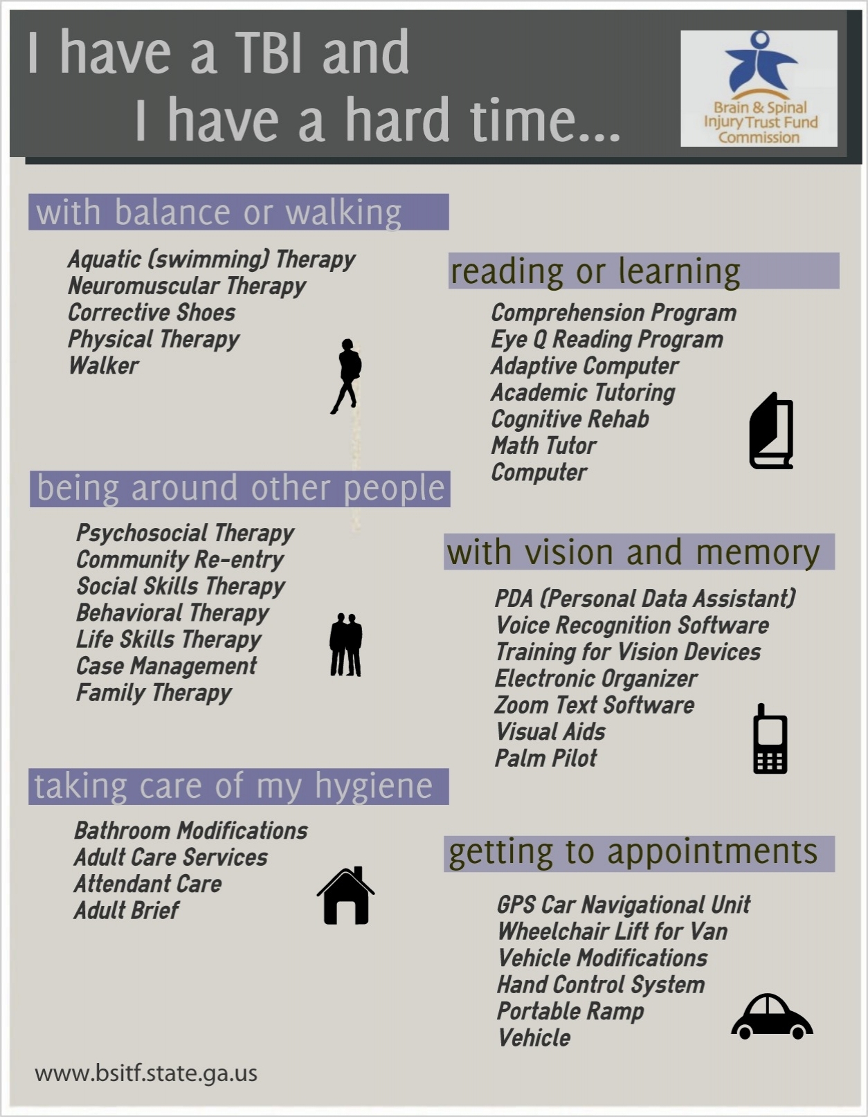 The Brain and Spinal Injury Trust Fund Commission was created to help Georgians with a traumatic brain or spinal cord injury with injury-related expenses. State residents with an eligible injury may apply for goods or services related to their injury; this request is not automatically approved.